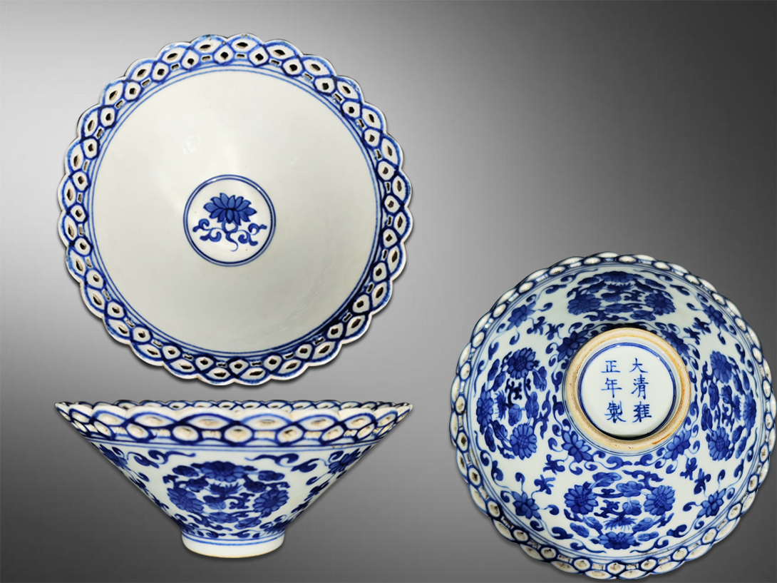 此件青花斗笠碗(盏),是雍正时期御窑瓷器的经典代表,融合了仿古技艺与创新设计,口沿的镂空展现了独特的艺术风格。形状与斗笠,胎骨轻薄,釉面莹润如玉,菊花纹饰色泽沉稳柔和,此类精品极其罕见,具有极高的观赏性和收藏价值。