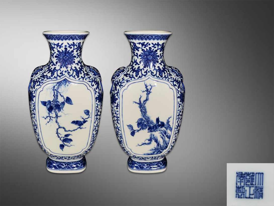 扁平的梅瓶最适宜摆放和上手玩赏,由于器型难度极大,只有官窑才去制作。 雍正时期的青花瓷器体现了整个青花的最高水准。本件具备这两项特别长处,无疑是青花瓷器中的璀璨明珠。 喜上梅梢的精美构图,青花篆体“大清雍正年制”底款,彰显了宫廷用器的高贵气质。