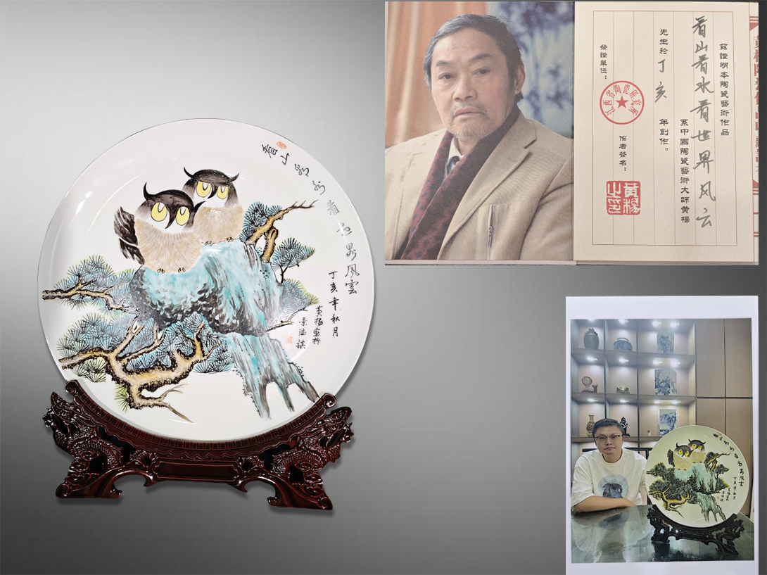 黄杨(1936-2019)号天后斋老人,出生于江西南昌的陶瓷世家,他是中国陶瓷艺术大师、江西省工艺美术大师、江西省非物质文化遗产传承人。作为景德镇动物写实瓷画开派宗师,独创“丝毛不叠、一笔成形”技法,以狼毫细笔蘸取浓淡墨色,在瓷胎上快速勾勒动物毛发,使绒毛的层次感与生命力跃然瓷上。尤其在猫头鹰创作方面,画风细腻,形态逼真,被尊称为“猫头鹰大王”,此件《看山看水看世界风云》已被韶山纪念馆永久收藏。
