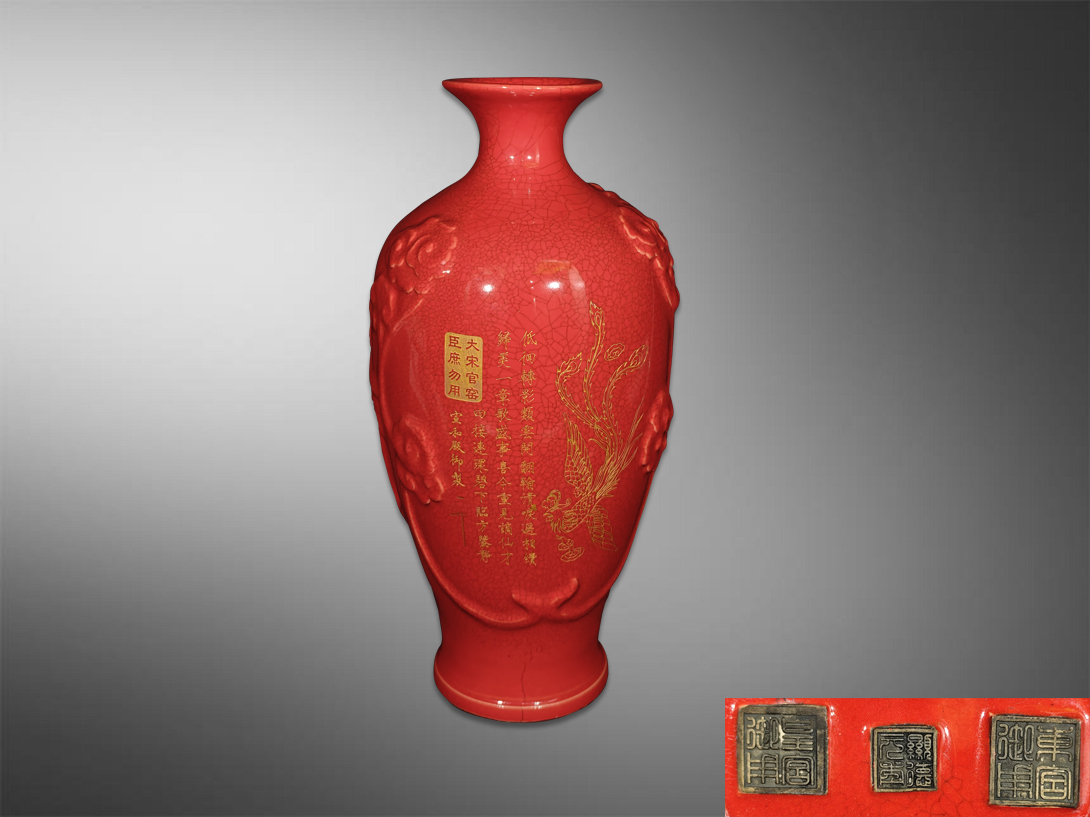 官窑玫瑰红塑胎凤凰如意瓶
