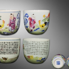 粉彩童子逗鸡图杯一对