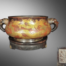 紫铜双龙耳错金龙纹香炉
