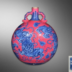 粉彩轧道胭脂红釉青花狮子滚绣球扁瓶