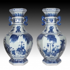 青花婴戏图双龍耳六方赏瓶一對