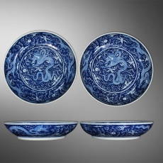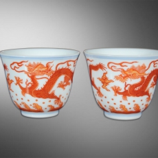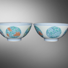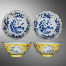 黄地轧道粉彩开光“三羊开泰”碗一对