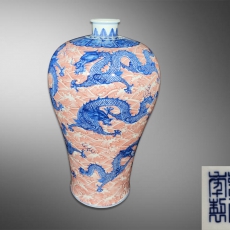 蓝地粉彩四开光麒麟朝凤纹赏瓶