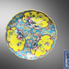 兰地开光皮球花粉彩葵口盘