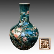 青地粉彩堆塑九桃天球瓶