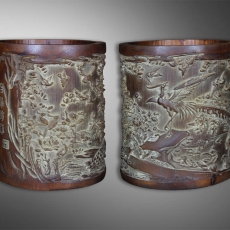 罗汉竹雕笔筒《百鸟朝凤》(浮雕)