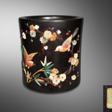 小叶紫檀嵌八宝喜鹊登梅笔筒