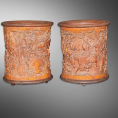 高浮雕竹雕笔筒(钟馗嫁妹)(朱文友刻)