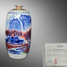 黄美尧 青花釉里红山水楼阁纹小口瓶